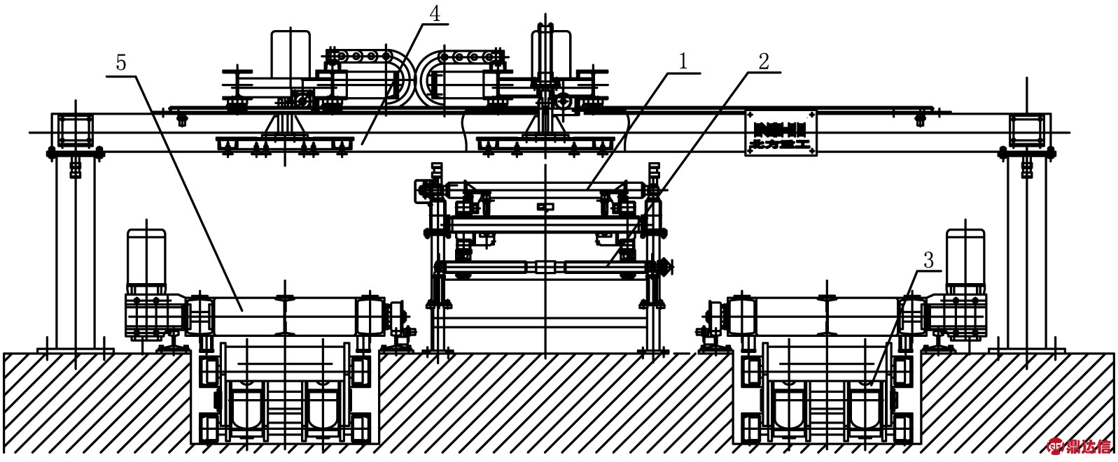 对中装置由两组对中机构组成,每组对中机构分别由丝杠螺母传动、气缸拍板、电机通过锥齿轮传动。对中开口横梁设有位移传感器,实时显示对中装置开口度。