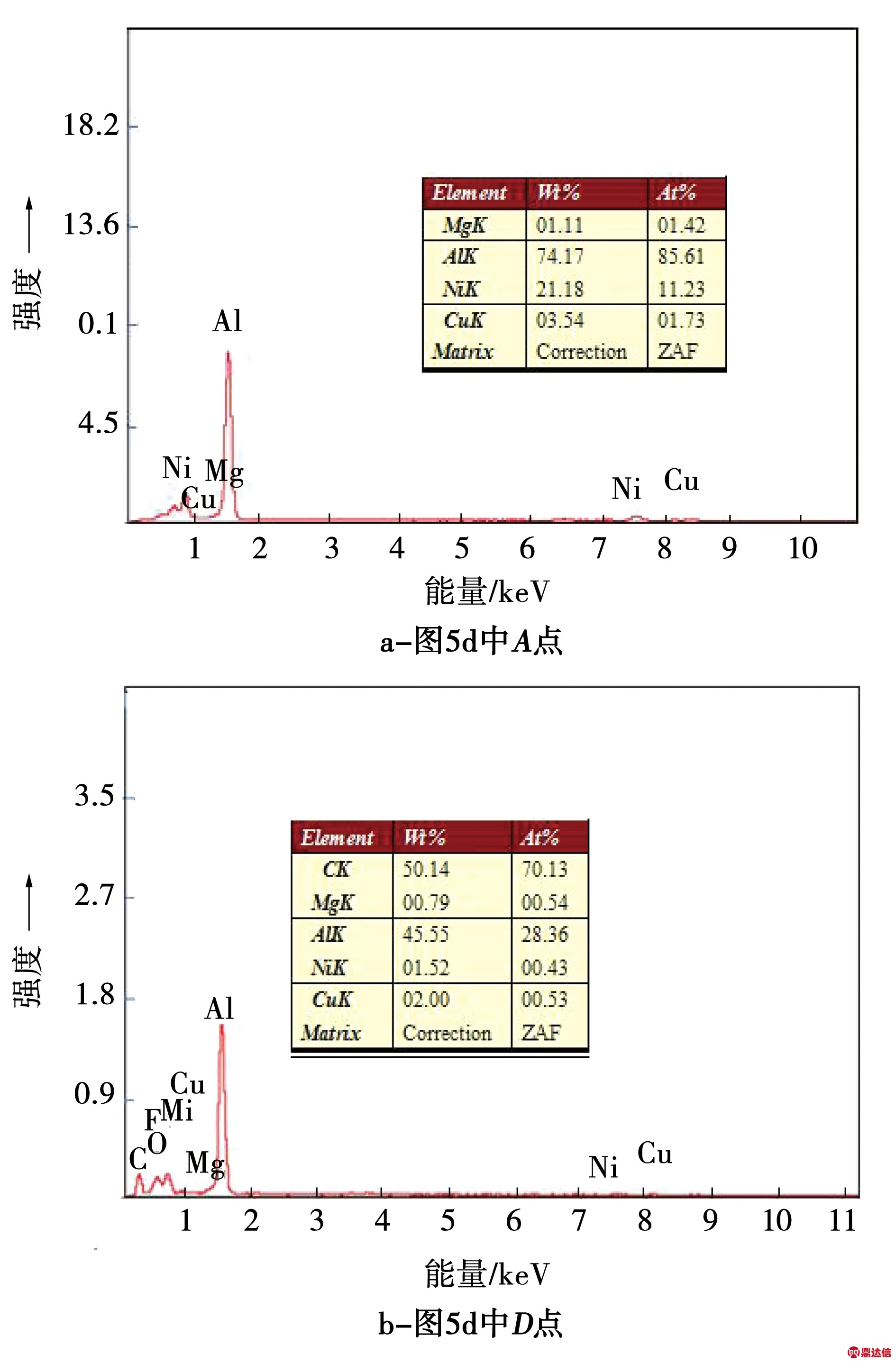图4a为6#试样的亮白相的EDS成分分析(图3d中A)结果。亮白相中含有Al、Ni、Cu和Mg元素,其中Al元素和Ni元素含量较高。根据Al-Ni相图,在600℃以上时,Al元素和Ni元素可能生成Al3Ni相,另外的分析中发现的Mg元素和Cu元素,为基体中的Mg和石墨烯及碳纳米管表面的铜在Al3Ni相固溶的结果。