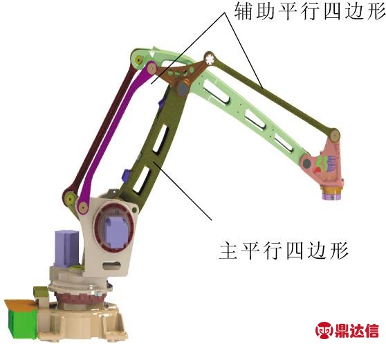 码垛机器人的双平行四边形机构如图1所示,由2组平行四边形组成。整个机构属于串并联混合机构。高速重载码垛机器人主要结构物理参数定义及数值如表1所示。