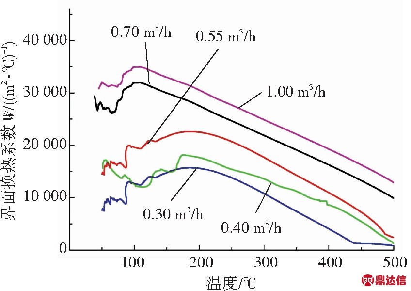 1)当喷水流量为0.3 m3/h时,峰值界面换热系数为15 707.4 W/m2· ℃;随着喷水流量的增大,界面换热系数增加且到达峰值的时刻越晚. 当喷水流量增加到1.0 m3/h,界面换热系数相比0.3 m3/h增大122.7%,到达峰值的时刻晚82 s.