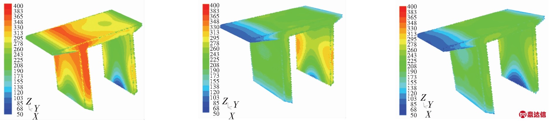 淬火冷却过程中型材温度的变化直接反映了型材表面与冷却介质间的换热情况,也是计算残余应力和变形的依据. 在相同的合金材料、冷却系统中喷嘴大小和喷嘴角度下,型材各表面冷却均匀性取决于喷嘴的流速以及型材的壁厚形状等几何特征. 距离喷嘴较近的端面,水流从喷嘴出口喷射到达型材表面的过程中散射量不大,水流速度变化不大,因而只需较小的喷水速度. 壁厚大的端面,单位时间内冷却所需的喷射水量和换热量要大,需要更高的喷嘴流速. 此外,各喷嘴喷射出的水最终都流经型材两侧,故两端下侧也比较容易冷却,所需的冷却水流速度较小. 为了直观全面地分析不同喷水冷却方案中型材表面温度场的分布规律,选取5和10 s时型材的温度场进行对比. 由图12可知,在5 s左右,方案一型材薄的悬臂端温度较低,约300 ℃左右,厚的悬臂端和上端温度较高,约为380~440 ℃;与方案一相比,方案二的型材温度分布更为均匀,但薄的悬臂端温度偏高,约为380 ℃,厚的悬臂端和上端温度较低,约320 ℃; 方案三的型材左右两端和上端温度分布都比较均匀,均在300~340 ℃左右. 由图13可知,型材淬火冷却到10 s时,方案一型材厚的悬臂端和上端温度显著大于薄的悬臂端,温差大小约为130 ℃;方案二的型材温度分布较方案一稍微均匀,但薄的悬臂端偏高,厚的悬臂端和上端较低,温差大小约为90 ℃;方案三的型材各端面温度分布比较均匀,均在200 ℃左右.
