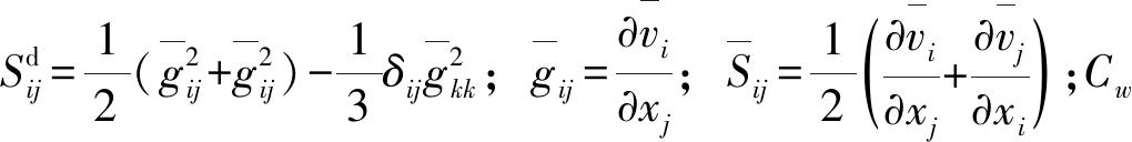 式中:τij为亚格子尺度应力(Subgrid-Scale Streese, SGS),主要体现流场小尺度涡对整个流场的影响。本研究中选取WALE (The Wall-Adapting Local Eddy Viscosity Model)模型来构建亚格子尺度模型,进行非稳态流场中小尺度涡的求解,其控制方程如式(5)所示。