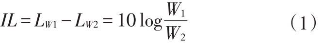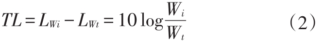 式中,LW1、LW2分别为安装消声器前、后某测点的声功率级;W1、W2分别为安装消声器前、后某测点的声功率;LWi、LWt分别为入射声功率级与透射声功率级;Wi、Wt分别表示入射声功率与透射声功率。