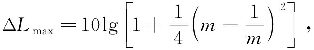 式中:m=(φ1/φ2)2=16为消声器的膨胀比.依据式(1)、(2)可得,文中膨胀腔消声器的最大消声量ΔLmax≈18.1 dB,通过频率f1=1 000 Hz,这与本文模型A的数值结果(见图4)吻合良好,验证了本文计算刚性条件下水消声器声学性能的正确性.