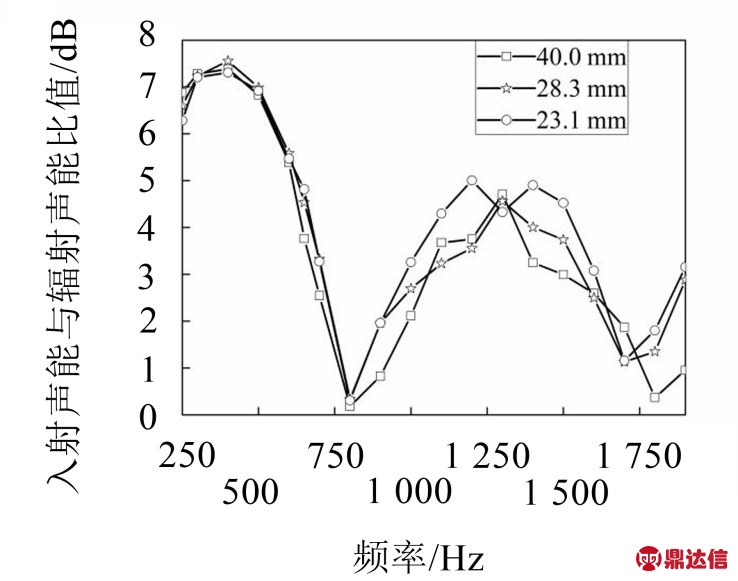 对比图4的计算结果与图7的测量结果,均在800 Hz及1800 Hz左右出现消声低谷,在1300 Hz左右均出现消声高峰,在250 Hz到600 Hz左右的低频范围的数值均高于1300 Hz左右的波峰。分析图7,试验结果在800 Hz到1900 Hz时,保持相同的截面面积,采用管径28.3 mm的双出口管比管径40 mm的单出口管反射回管内的总声能多,向外辐射的总声能少;采用管径23.1 mm的三出口管比管径28.3 mm的双出口管反射回管内的总声能也多,向外辐射的总声能进一步减少;采用管径23.1 mm的三出口管比管径40 mm的单出口管向外辐射的总声能减少得更明显。测量结果与计算结果都反映出减小出口管直径对减少噪声辐射有利,研究表明利用管口反射声能的特性后,消声器采用多管出口能够起到一定的提高消声作用。