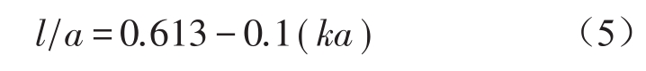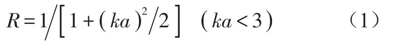声波在刚性壁管道中传播时具有开管的特性,理论上开管在管道末端具有反射特性[5]。对于这种反射现象,盛胜我做了深入研究,测量了管道出口的声压反射系数,结果表明当管口附近没有其他反射体时,管内平面波到达管口,其中一部分将反射回管内,一部分辐射到管外空间[6]。通常波数k与管口半径a的乘积小于3,盛胜我研究得出了在ka小于3的情况下,声压反射系数幅值R的近似表达式