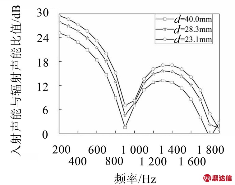 试验中吸收的声能量即是通过管口辐射出去的声能量,由吸声系数曲线可以获得入射声能与辐射声能比值的曲线,单位用分贝表示,获得消声性能曲线如图7。