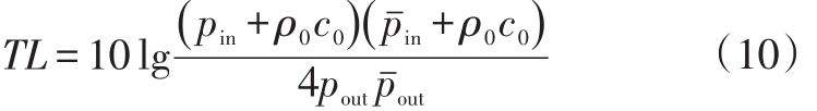 传递损失是评价消声器声学性能的重要指标,定义为消声器进口入射声功率级与出口透射声功率级之差。传递损失与声源特性和尾管辐射特性无关,是消声器本身具有的特性,因此在消声器设计及数值计算时使用传递损失作为评价指标非常方便。假设消声器内部介质为理想气体,进、出口管直径相同,进、出口管内声波以平面波模式沿管道轴向传播。有限元计算时,在进口施加单位质点振速,出口设置为全吸声边界条件,穿孔管两侧设置传递导纳属性,其他壁面默认为刚性壁面,消声器传递损失为[5]:
