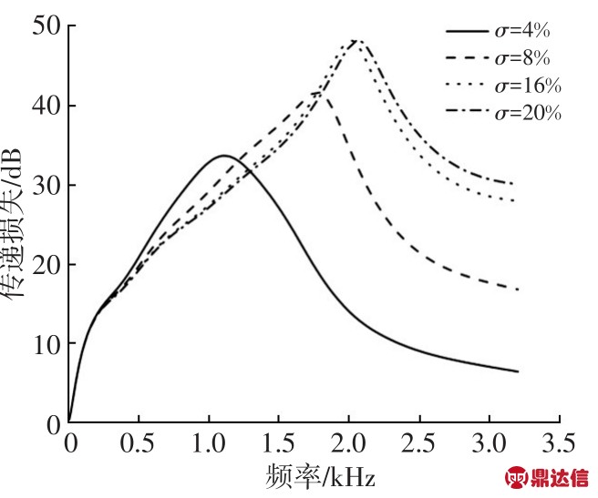 图5给出了流阻率为4 896 Pa·s/m2,穿孔率分别为4%、8%、16%、和20%时椭圆形截面穿孔管阻性消声器的传递损失曲线,消声器的其他结构参数与3.3节中参数相同。可以看出,随着穿孔率的增大,传递损失峰值频率向高频方向移动,且穿孔率越大,消声器中高频消声性能越好。这是因为,随着穿孔率增大,更多声波通过小孔进入吸声材料中,引起吸声材料振动并与周围空气介质摩擦,将声能转化为热能耗散。在阻性消声器设计时,应保证较高的穿孔率以提高消声器中高频消声性能。