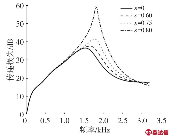 在保证消声器腔室截面积均与3.1节中圆形截面积相等,且其他参数不变的前提下,当椭圆截面偏心率ε分别为0、0.60、0.75和0.80时,消声器传递损失仿真曲线见图3。由图3可知:偏心率对低频域传递损失影响不大;在中高频区域,传递损失随偏心率的增大而增大,且峰值频率向高频方向移动;在3 010 Hz以上的高频区域,偏心率越大,传递损失反而越小。