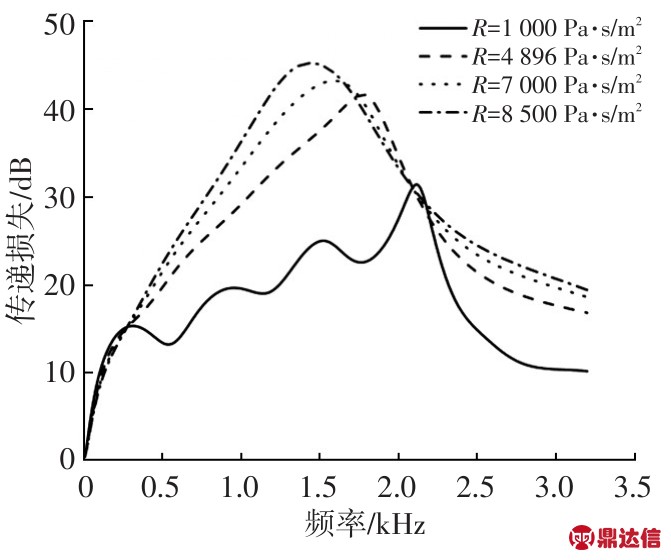 (长轴长2a=193.502 mm,短轴长2b=138.180 mm),小孔直径d=2.49 mm,穿孔率σ=8%。流阻率R分别为1 000 Pa·s/m2、4 896 Pa·s/m2、7 000 Pa·s/m2和8 500 Pa·s/m2时的消声器传递损失如图4所示。由图4可以看出:在低频区域,传递损失曲线差距很小,说明吸声材料对低频域消声性能影响不大;在中高频区域,随着流阻率的增大,传递损失也增大,且峰值频率向低频方向移动;当流阻率为1 000 Pa·s/m2时,传递损失曲线既表现出抗性消声器拱形衰减特性,又表现出阻性消声器宽带衰减特性。