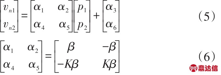 式中,vn1、vn2分别为穿孔管内、外侧法向质点振速;p1、p2分别为穿孔管内、外侧声压;α1、α2、α4、α5为传递导纳系数;α3和α6由声源系数确定,在消声器传递损失计算中,α3和α6均为零;K为考虑穿孔管厚度对穿孔管两侧面积影响的修正系数,其值为穿孔管内径与外径之比;β为穿孔管导纳,其值等于穿孔管阻抗的倒数。