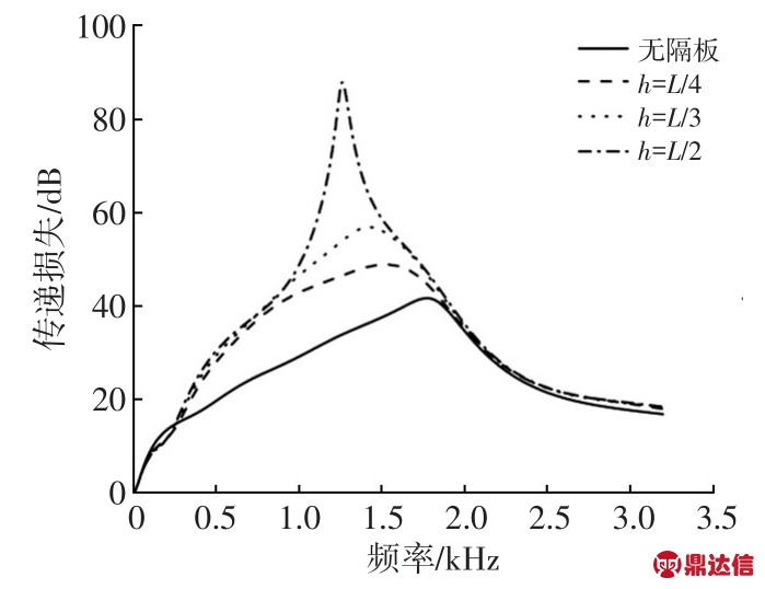 消声器腔室内放置隔板对阻性消声器传递损失有较大影响[8],这种消声器的结构如图6所示,其中,h为隔板与消声器腔室前端面的距离。仿真时,消声器内隔板厚度dh=0.9 mm,吸声材料流阻率R=4 896 Pa·s/m2,其他结构参数与3.3节中参数相同。图7为无隔板和隔板处于不同位置的椭圆形截面阻性消声器的传递损失。由图7可以看出:隔板位置对小于280 Hz的低频区域和大于2 000 Hz的高频区域的传递损失影响很小;在280~2 000 Hz频率范围内,随着h的增大,消声器传递损失也增大,且峰值频率向低频方向移动。对于h=L/2的消声器,在1 260 Hz时传递损失达到88.015 dB。可见,在阻性消声器设计中,合理选择隔板位置,可以改善特定频率段的消声性能。