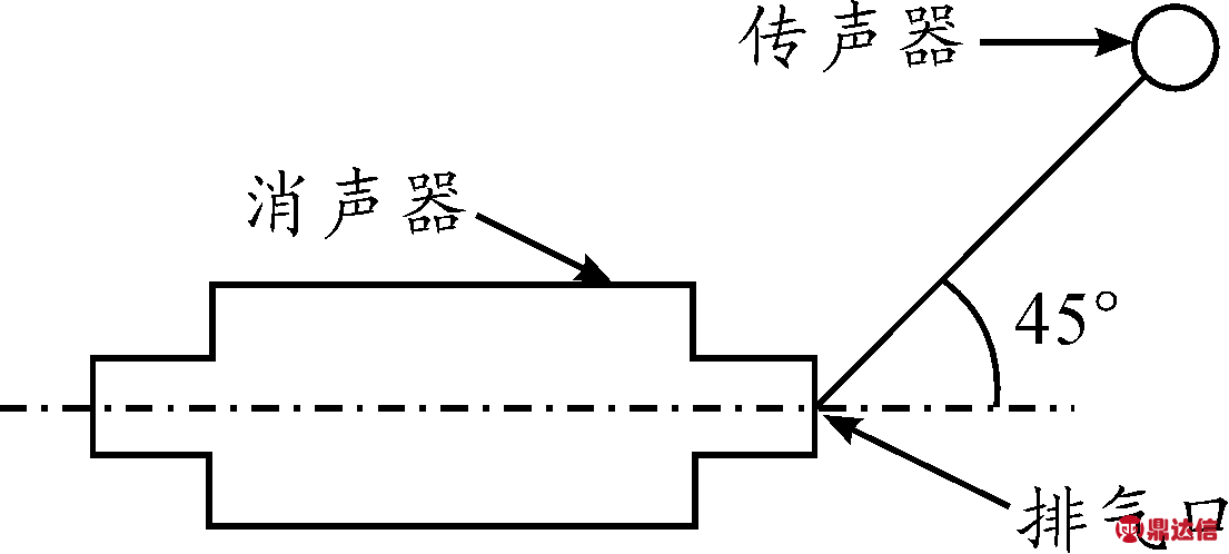 实验方法参照《内燃机排气消声器测量方法》(GB/T4759—1996)进行[12]。使用采样频率25.6 kHz的B&K3560型噪声测量分析系统; 转换精度为ADC/DAC 24 位;声音灵敏度为50 mV/Pa 。每次连续测量前后对仪器进行校准,声级校准器的误差低于0.5 dB。测量时,背景噪声需满足比被测噪声低10 dB的条件,且测点处的风速低于2 m/s。测点位置距离出口端 0.5 m 处,与消声器轴向成45°,如图8所示。实验过程中,测点和消声器相对位置固定,传声器距地面高度大于1 m,与其他反射面间距大于2倍测距。