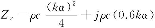 式中:A,B,C,D和A′,B′,C′,D′为带有消声器和用等长度直管代替消声器后的四端子参数;ρ为介质密度;c为声速;Zr为管口辐射阻抗率。管口辐射阻抗率可由经验公式(9)求得。