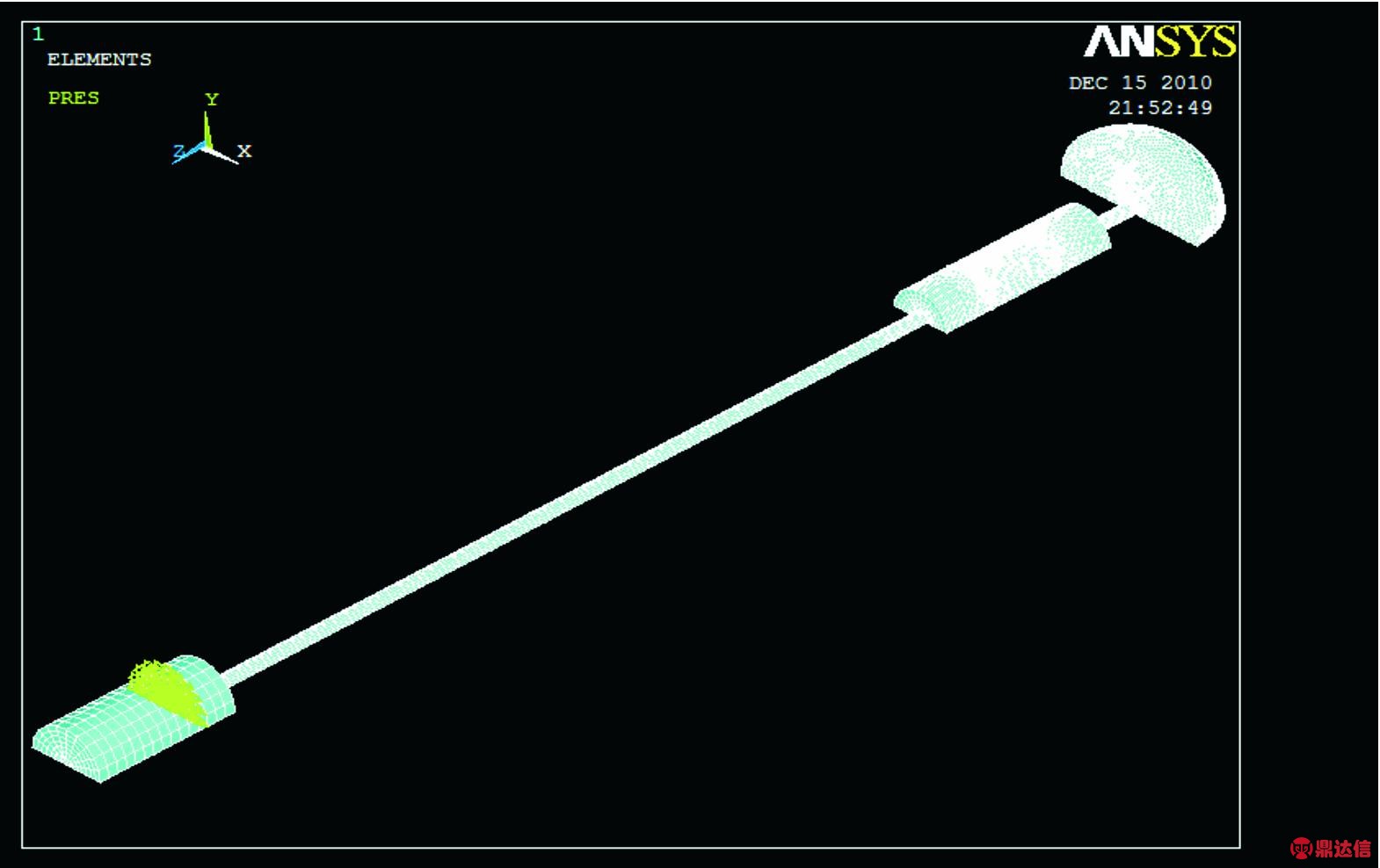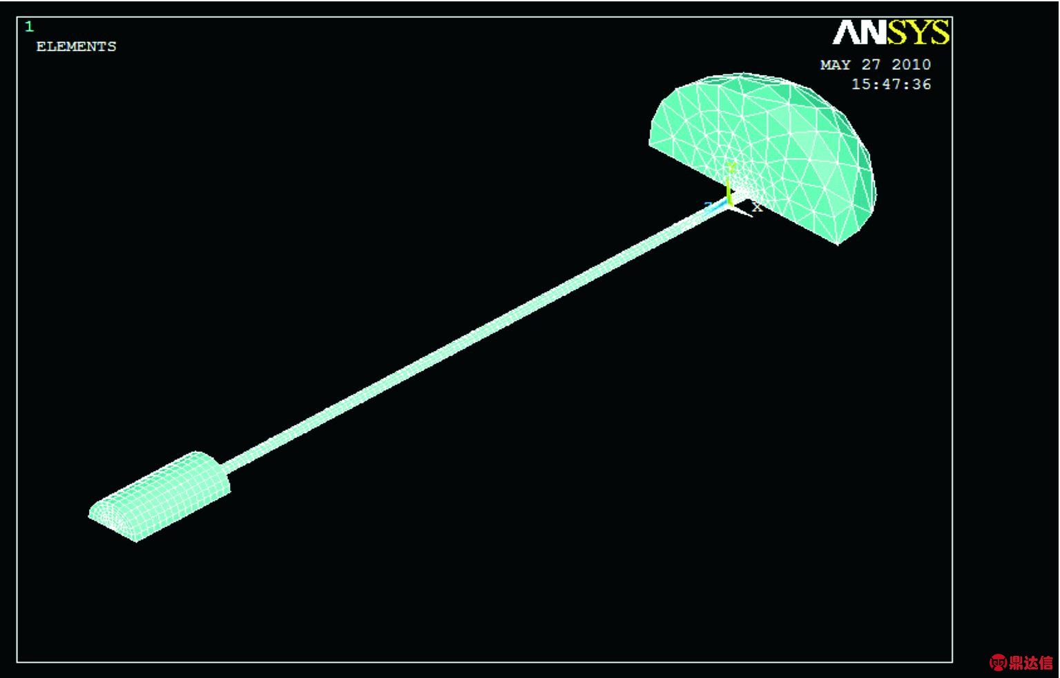 直接模拟法又称定义法,即根据插入损失的定义,利用ANSYS软件来模拟实验情况而得到插入损失。依据国家标准GB/T4759—1996要求布置包括声源、连接管、消声器或者与之等长的直管,以及消声器出口处的声场四者组成的排气系统模型[11]。在消声器出口管处建立远场声学模型,可以求得离出口处0.5 m×45°处的声压。其中,出口处声场的球面用FLUID130无限远声学单元模拟无反射的无限远声场,其余用FLUID30声学单元。图2、3分别为带消声器和不带消声器(用等长直管代替)的排气系统有限元模型。在这2个排气系统有限元模型的声源入口处加载声压,得到相应的出口声压P0和P1,再由式(12)得到插入损失。