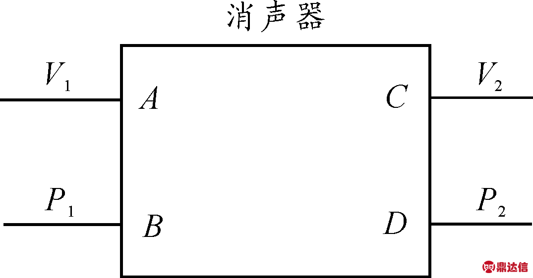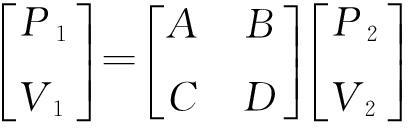消声器的进出口两端的参量可以看成类似于电学系统的四端子网络结构,如图1所示。由四端子网络理论,P1,V1与P2,V2有如式(1)所示的矩阵关系。