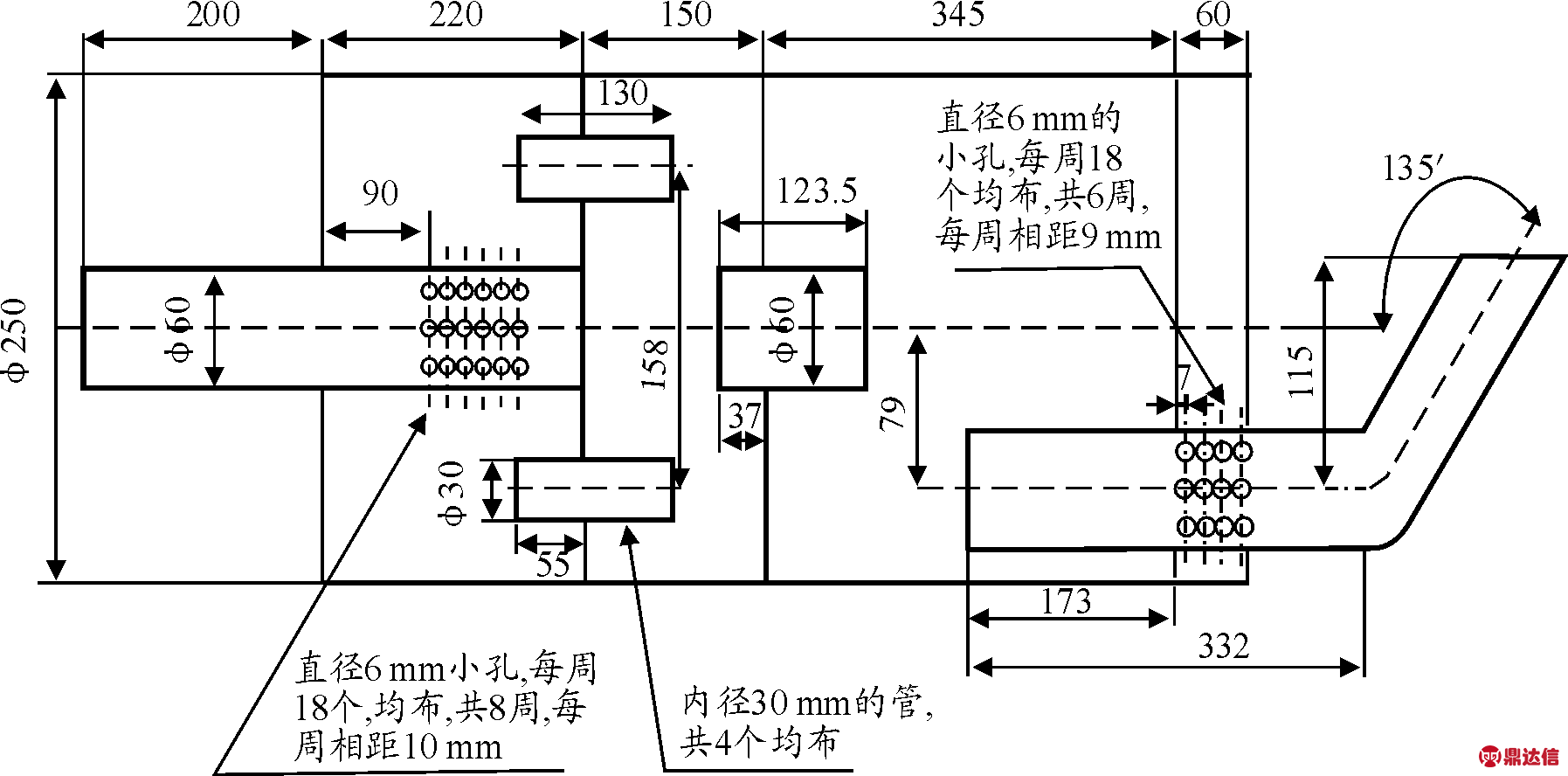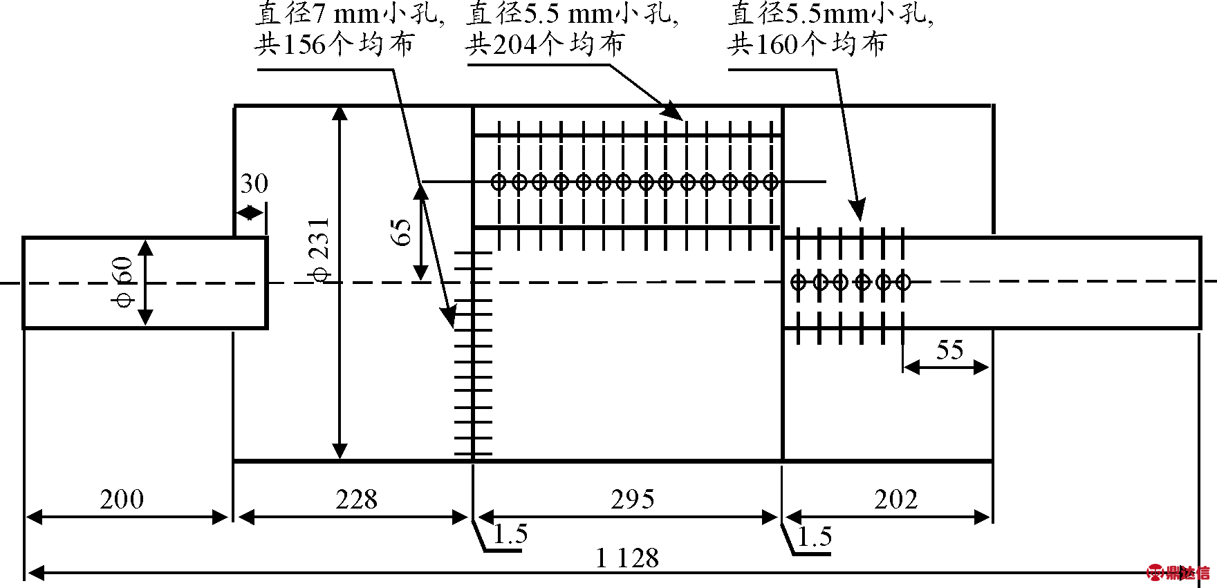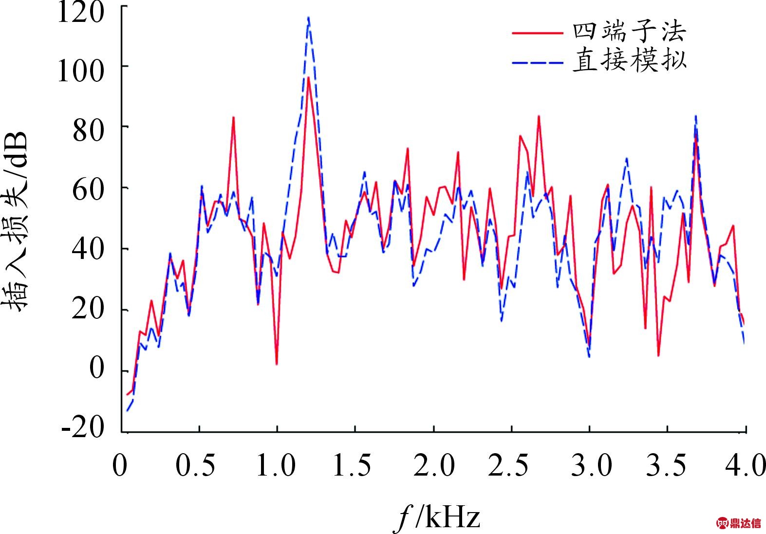 原消声器A的结构示意图如图4所示。该消声器包含3个内部腔室,第1腔和中间腔之间的隔板采用了穿孔板结构,中间腔和第3腔通过一个偏置的穿孔管连接。出口管布置为穿孔模式,其中,穿孔板均匀分布着156个φ 7 mm的小孔,中间腔与第3腔的穿孔管部分均为φ 5.5 mm的小孔,数量分别为204和150。分别应用传递矩阵四端子参数求解法和从定义出发的直接模拟法来求消声器的插入损失。