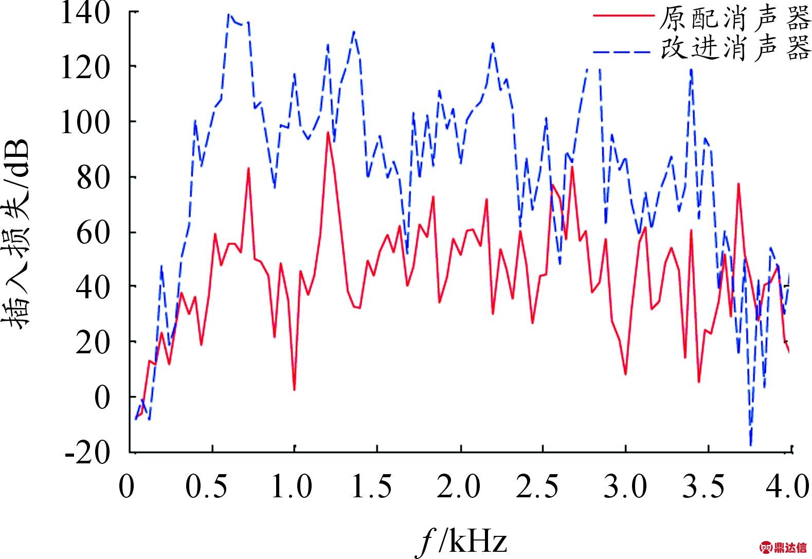 由图7可见:改进后的消声器B的插入损失与原消声器A相比有了较大的提高。在200~3 600 Hz的主要频段,消声器B的插入损失大幅提高,基本保持在60 dB以上,且多次达到100 dB以上。但是在小于200 Hz和高于3 600 Hz的范围,优化结果不够理想。总体比较,改进方案较为理想,实现了消声性能的大幅提升,并且改善了1 000,3 000和3 450 Hz处的通过频率。