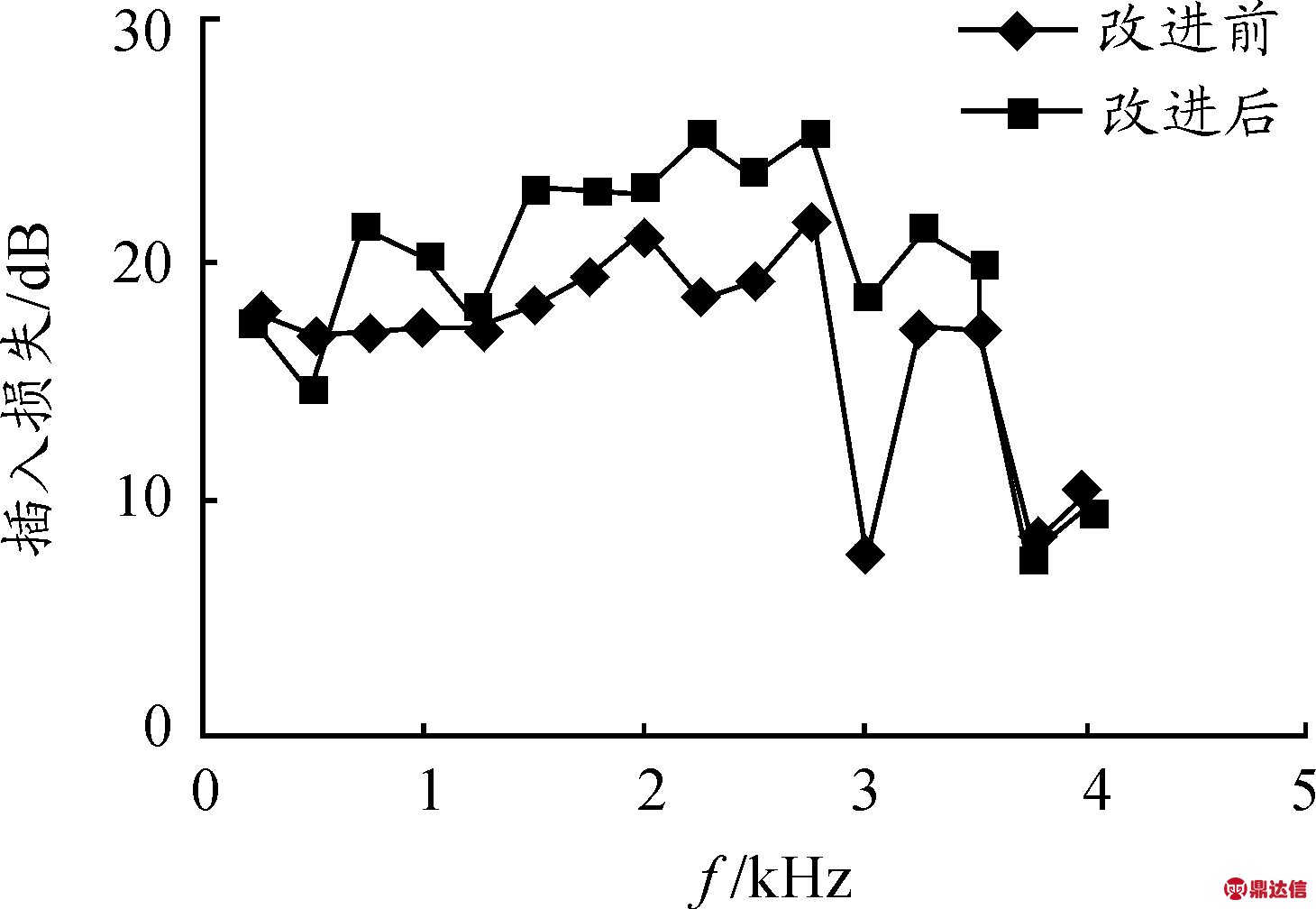 改进前后消声器系统排气噪声频谱图的实验结果如图9所示。此时柴油机的转速为2 500 r/min。实验结果显示:在250~500 Hz左右的低频段和3 500 Hz以上的高频段,优化后消声器B的插入损失不及原消声器,但是在大部分中频域,优化后消声器的插入损失均高于优化前。总体来看,尽管存在数值大小的差异,但与两种有限元方法所得的趋势是一致的。