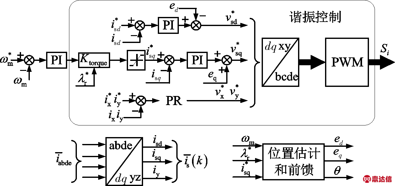 图3为故障容错PR控制器框图,图中所示,转速和磁链控制在转子磁链定向dq同步旋转坐标系中完成,其中d轴电流参考值设置为恒定值,q轴电流参考值由转速PI控制器输出得到。由于采用电流控制,因此采用标准五阶Clarke变换矩阵[T5]计算αβ轴电流和xy轴电流。和MPC方案类似,通过式(16)将dq轴电流映射在αβ静止坐标系中,并基于式(17)间接估计转子磁链矢量位置θ。与MPC方案的主要区别在于电流内环采用线性控制器,线性控制器结合标准前馈项ed和eq以提供αβ轴和xy轴电压参考,增加前馈是为了提高控制器性能。