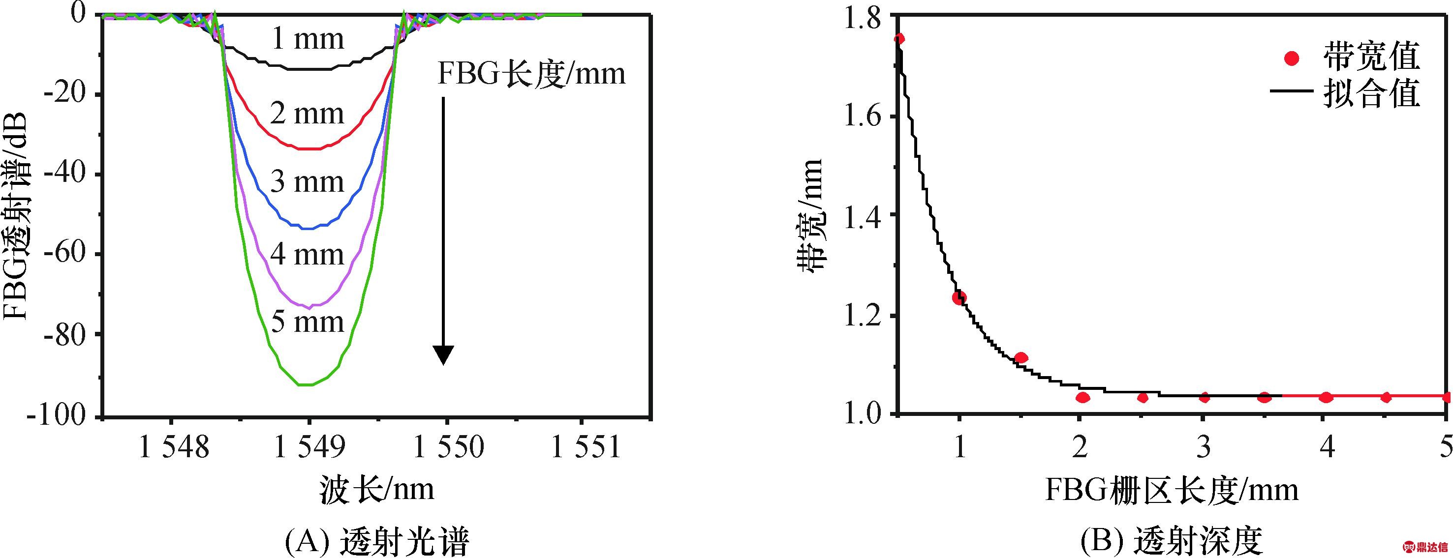光源为1 550.1 nm激光器,为保证当FBG的中心波长漂移时,激光仍被FBG反射,实验需要较大带宽的FBG. FBG的带宽与其栅区长度有关,用Optiwave软件对不同栅区长度的FBGs进行模拟仿真,纤芯的直径为8 μm,反射率为1.46,包层直径为125 μm,反射率为1.445,光纤光栅的FBG波长为1 549 nm,模式参数为8.817×10-4(图3). 随着FBG的栅区长度增加,其透射谱深度逐渐增加(图3A),而其3 dB带宽随之减小(图3B). FBG的栅区长度从0.5 mm增加到2.5 mm时,其3 dB带宽迅速下降,在栅区长度增加至2.5 mm后,其带宽基本不变,而且随着光栅长度的增加,光栅的反射率增加,透射率减小.综合考虑FBG的反射率和带宽要求,选择了栅区长度为1 mm的FBG.