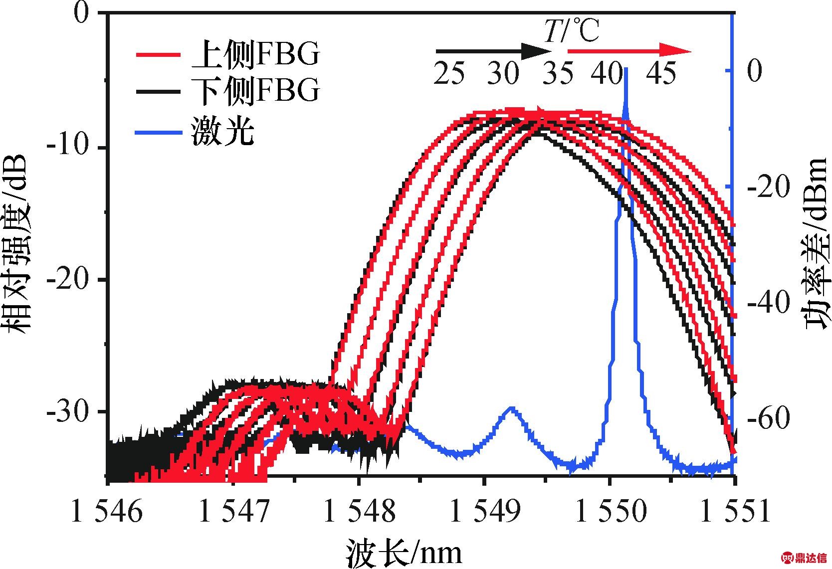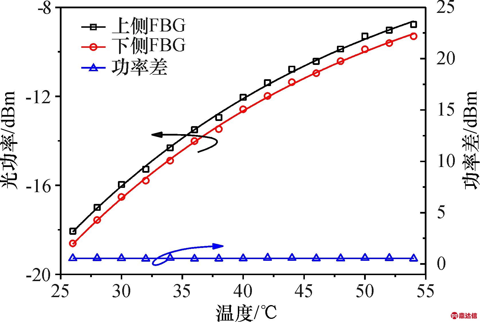 图9 上下侧 FBGs反射的光功率及其差值随温度的变化