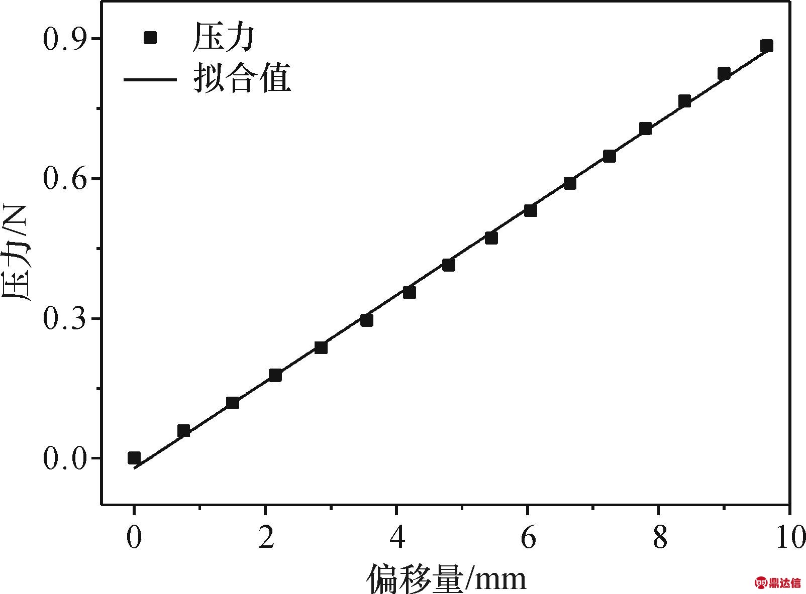 由式(5)可知,悬臂梁自由端的压力与自由端的偏移量成正比关系. 图2为实验所用悬臂梁上的压力与其偏移量的关系图,与式(5)的结果相符合. 因此,可根据悬臂梁自由端的偏移量求出外界垂直压力.