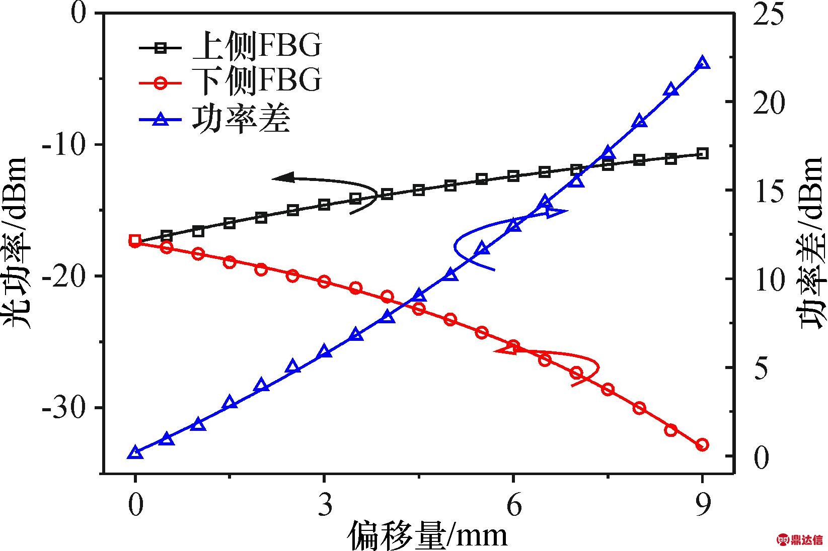 图8 上下侧FBGs反射的光功率偏移量及其差值随悬臂梁偏移量的变化