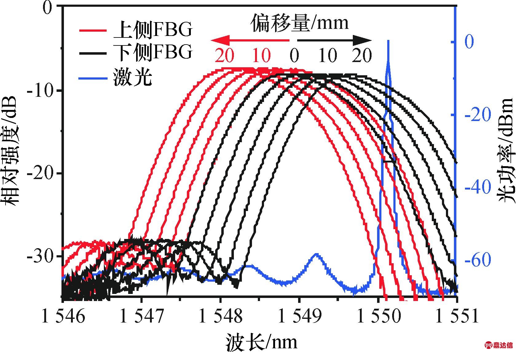 图6 不同偏移量下FBGs的反射谱和激光的透射谱