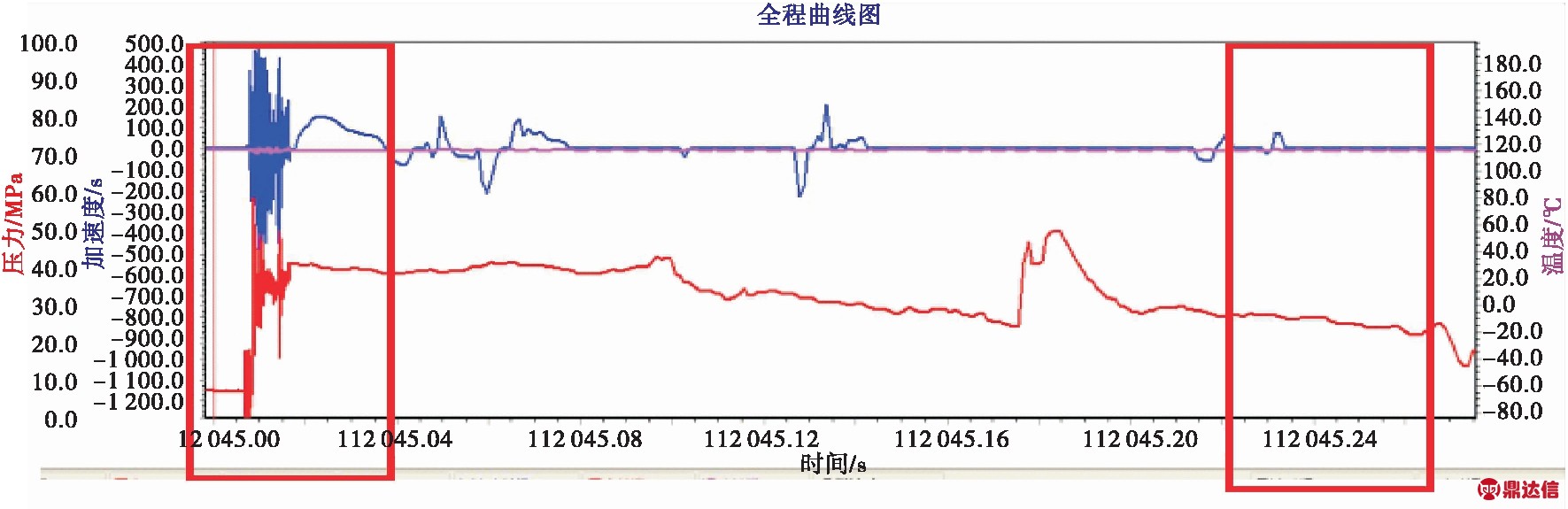 利用高速压力计完成射孔瞬间的加速度、压力及温度的检测。记录数据完整,如图5所示。