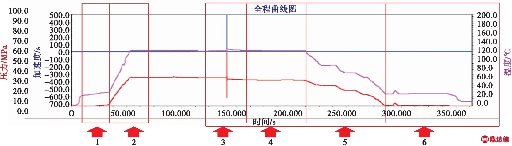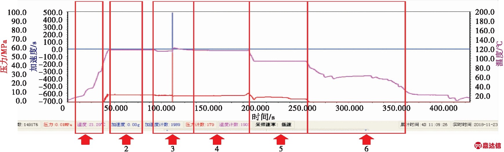 利用高速压力计完成射孔瞬间的加速度、压力及温度的检测。记录数据完整,如图7所示。过程如第一次试验整体下井过程数据分析中的6个阶段。