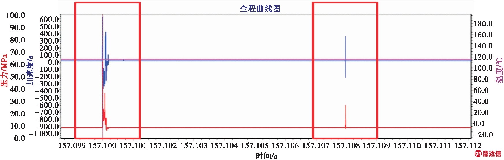 将时间轴拉伸,放大射孔瞬间曲线,通过曲线可观察射孔瞬间压力、温度及加速度的变化,详细曲线如图8所示。