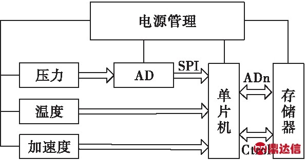 压力信号采用外部14位AD7484芯片,转换的数据通过SPI传输到单片机,单片机内部采用DMA控制与CPU之间进行数据交换;温度和加速度为单片机内部12位AD采集,采用DMA控制与CPU之间的数据交换。压力、温度、加速度最高均为100 K的采样速率。