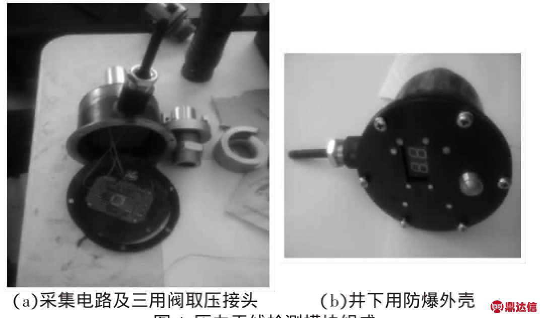 由上述的压力传感器及其电路、井下用防爆电池、无线通信控制器芯片、新型三用阀取压接口和井下用防爆外壳等模块组成的矿山本安型无线压力计如图4所示。