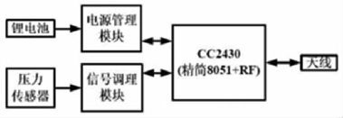 压力无线检测模块在整个无线传感网络中属于最前端终端设备,主要由CC2530(或CC2430)主控制器模块、电源管理模块、压力传感器、信号调理模块,以及时分复用模块组成,如图1所示。