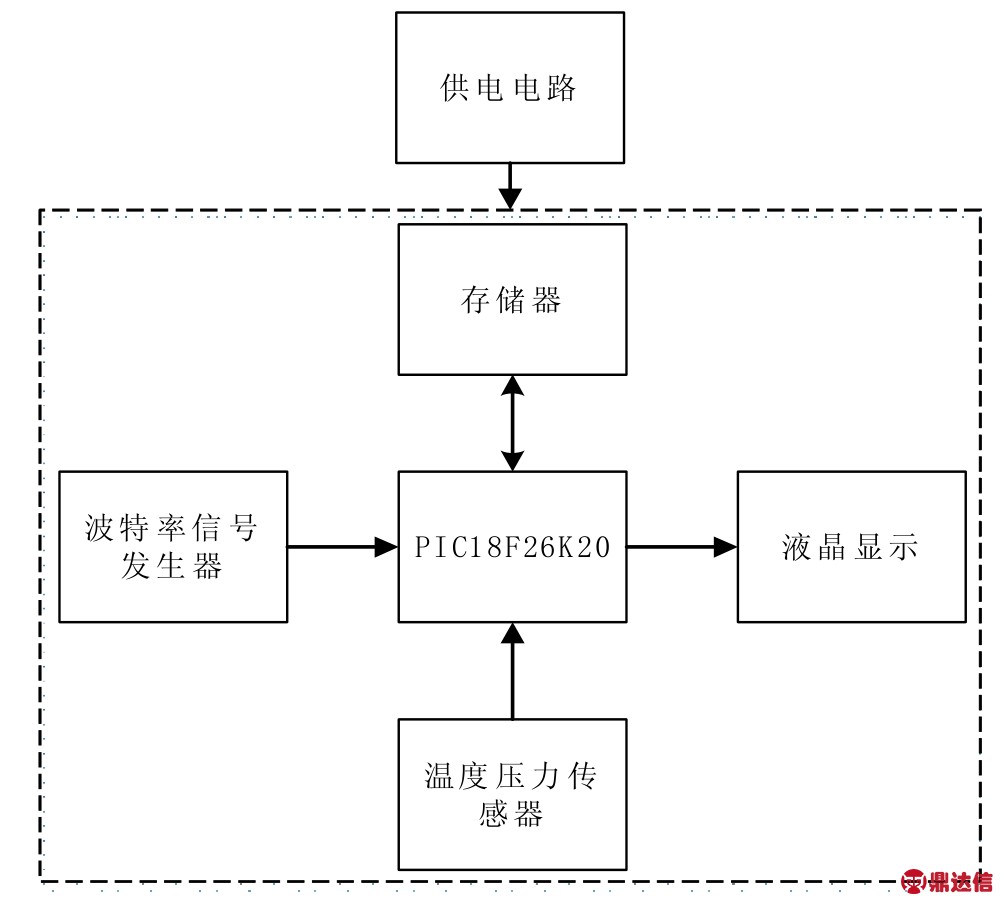本设计以PIC18F26K20芯片的电路为基础,通过软件程序来控制单片机内部的定时器,实现对油井温度、压力等参数的周期性测定。采用电池供电的方式,外接波特率信号发生器,井口压力信号通过内置在压力计内部的扩散硅压阻式芯片采集进来,经A/D转换后传送给处理单元单片机,处理后的数据传送到存储器存储,并通过传输线实时传输,在液晶显示器上显示。总体结构框图如图1所示。