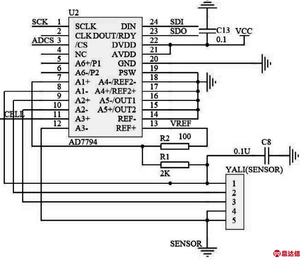 本设计利用压阻式原理采集压力,并通过AD7794转换后,传输到PIC单片机。信号采集电路中包括Keller sweies 8型压力传感器、阻值分别为2K和100R的两个色环电阻、滤波电路、AD7794转换芯片等。压力信号采集电路如图2所示。