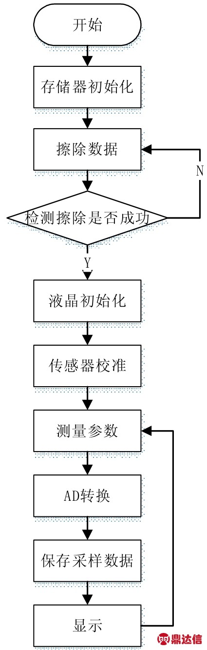 主程序控制着单片机系统按照预定的控制方式运行。系统上电之后,先行对存储器进行初始化操作并擦除残留数据,显示模块初始化,并对传感器进行校准。通过对实际环境中参数的采集,通过AD转换到单片机,并按照指令将数据保存并显示。主程序框图如图3所示。