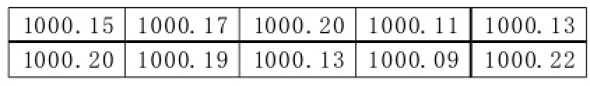 该装置研制完成后需对比进行量值溯源,方可作为标准器将量值向下传递。该装置的主要技术指标为:压力测量范围:(300~1200)hPa;压力测量精度:±0.5%FS。在量值溯源过程中,需利用精度高于该装置精度1/3的标准器作为标准,考核该装置测量此标准器的测量结果是否准确。实验中取一精度为±0.1%FS的绝对压力传感器作为标准器,将其与该装置进行连接后启动该装置对其进行测量。测量结果取1000hPa点测量10次数据进行分析,试验数据见表1。
