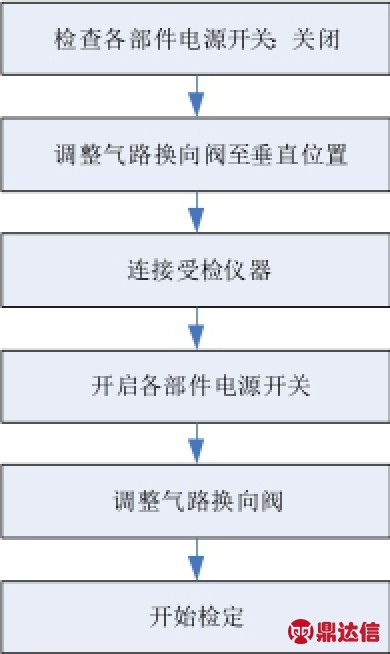 系统气路连接完毕,依次开启总电源、正压源和负压源开关,开启工控机。根据实际检定工作需要,将气路换向阀旋转至相应指示位置。具体操作流程如图3所示。