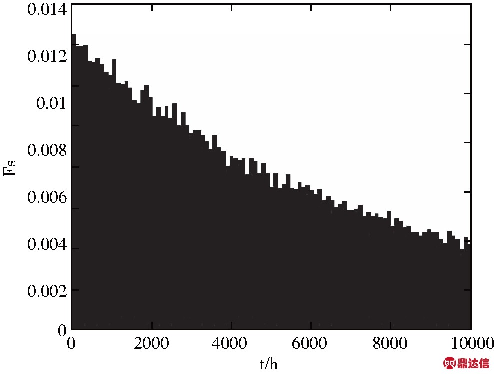在图7中,用直方图表示了压力计电子系统在寿命的不同时期的失效概率分布以及变化情况。横坐标上每一个直方图的跨距为100小时,纵轴是在仿真过程中失效事件分别落在不同时间区间的概率。电子压力计的失效概率分布直方图也是基本服从指数分布的。这也说明,电子元器件主要以指数分布的形式失效,与理论相符合。