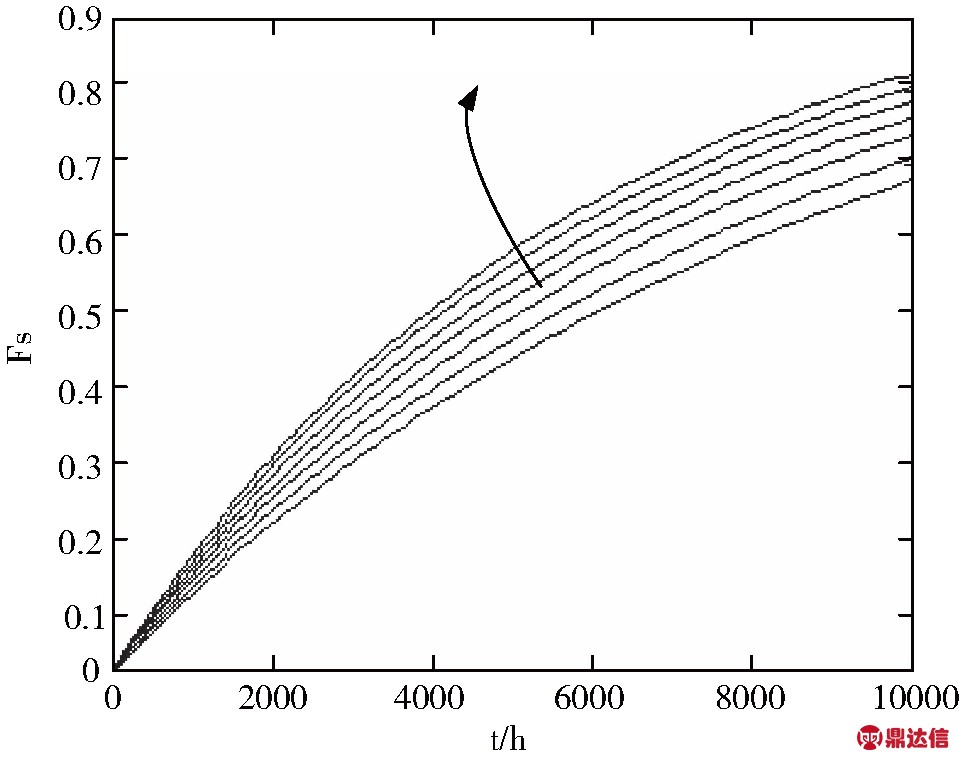 在图4中,在其它元器件失效率不变的情况下,沿着箭头方向的7条曲线分别是单片机失效率为1次/106小时,12次/106小时,22次/106小时,32次/106小时,42次/106小时,52次/106小时,62次/106小时的累计失效率系列曲线。随着单片机失效率不断增加,电子系统的累计失效率曲线不断沿着箭头的方向移动,即系统的累计失效率逐渐增大。当其它元器件失效率增加时,有着类似的规律。
