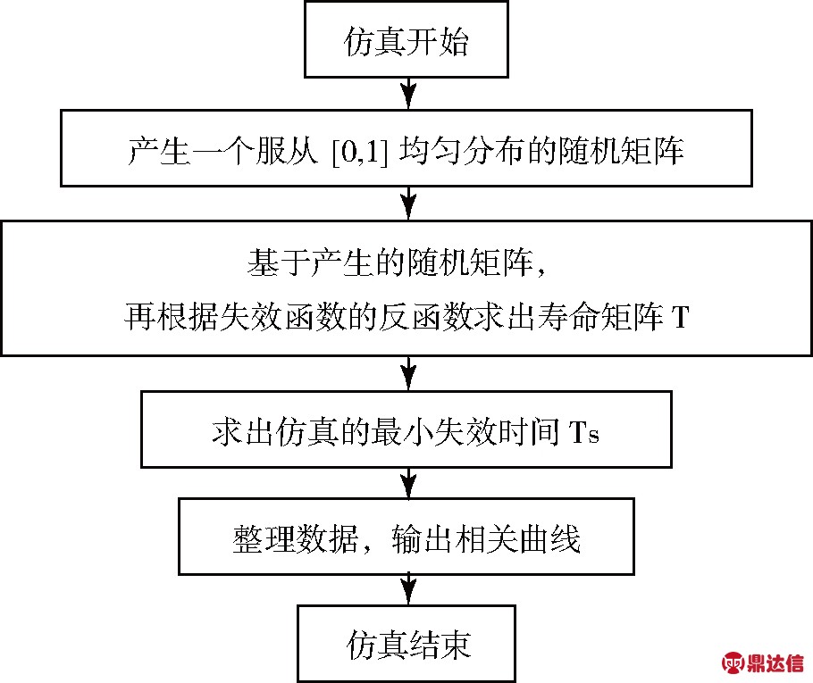 其中,η为[0,1]区间上均匀分布的随机数。通过该抽样方法可以得到N次仿真系统的寿命矩阵T,该矩阵的维数为N×n,矩阵的每一行即为系统的一次仿真。再利用MATLAB提供的函数,求出每一次仿真的最小失效时间矩阵Ts,该矩阵的维数为N×1。