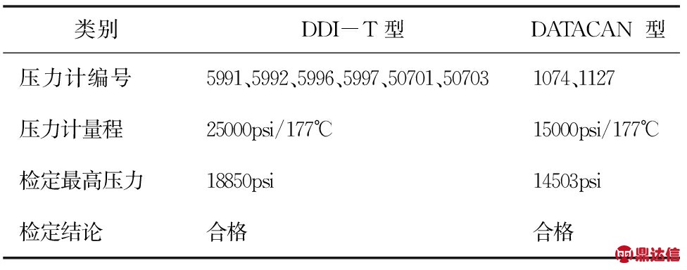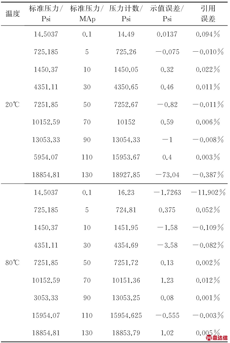 电子压力计标定通用接口箱研制完成后,经反复试运行(最长烤机 50 多个小时),仪器性能稳定,状态良好,完全达到了对电子压力计标定使用的目的。例如:使用接口箱对DATACAN、DDI-T两种型号的压力计进行实际的检测和标定作业,达到了预期效果( 图2,3 )。DDI-T 压力计在20℃、80℃下标定数据的误差分析中,误差均在有效范围内(表 1 )。