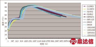 鉴于空气浴加热传温速度较慢,无法更为准确的测出压力计仪器确切的感温性能。设计实验如下:分别选取了上海富大,大庆鑫宏阳,三江航天,大庆九方4个厂家生产的压力计,设置采样时间后,一起投入到温度达到80℃左右的水浴当中,保持15min后起出观察其感温示值情况如图2:分析上图我们可以看出,几乎所有的压力计感温时间都很短,在130S内即可达到水浴温度。将感温段放大如图,即可明显看出各型号压力计的感温性能。我们通过在感温瞬间,压力计温度上升示值的曲线的斜率,即可看出各个型号压力计的感温时间长短。从图中可以明显的看出,温度传感器外置的压力计(型号为12030641、12031642、08P1125)感温速度明显少于其他型号的压力计,基本上在10S左右。而就算温度传感器同样内置于压力计内部,其感温时间差距也很大。大庆九方压力计感温时间为40S左右明显少于感温时间为60S左右的三江航天压力计,而大庆鑫宏阳压力计的感温时间相比其他型号的电子压力计感温性能就要差一些了,大概需要100S左右才能到达水浴温度。分析原因,我认为是由于各厂家使用温度传感器的选择、电路的设计加工以及软件的编制等的不同都对误差有影响。但是,但以上数据也只是选取了几只压力计的对比,并不能排除系统误差的影响。