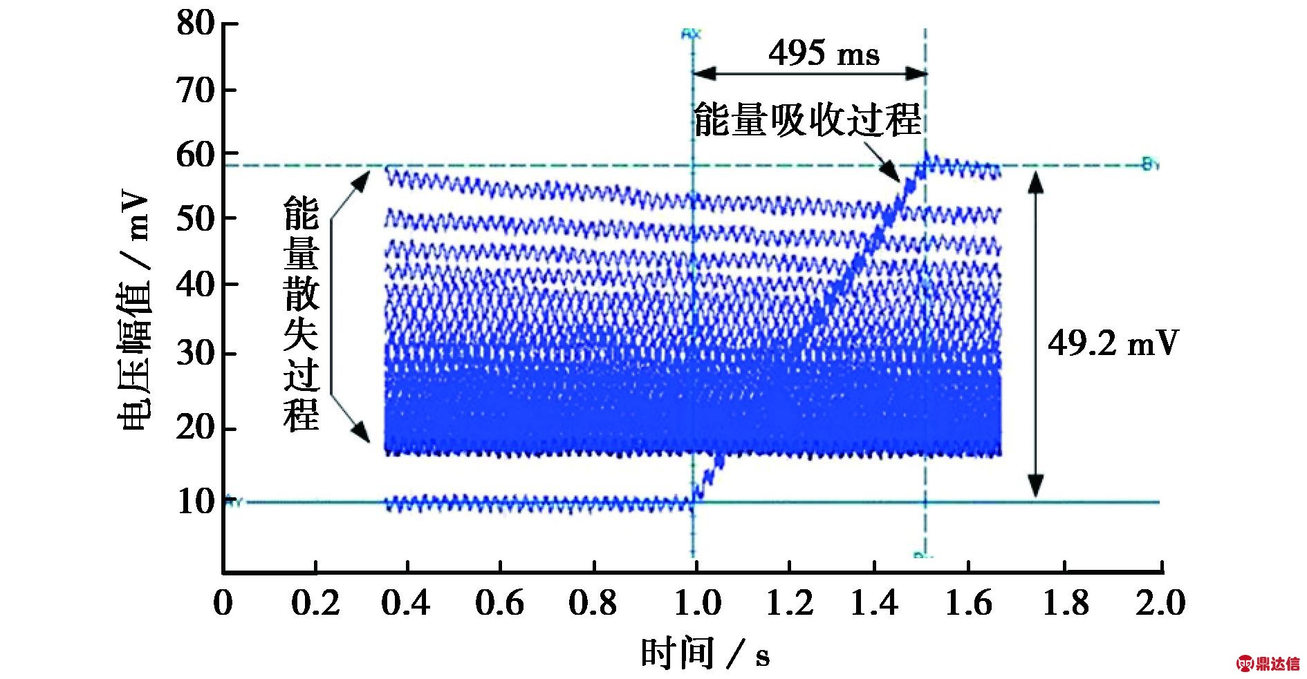图5为实验中得到的典型波形(由于示波器存储深度有限,在实验中采用余辉显示,可得到完整实验波形:上升段为能量吸收过程,中间下降段为量热计与外界的热交换导致的能量散失过程),图中横轴为时间,纵轴为传感器输出电压.此时微波源的重复频率为200 Hz,脉冲数为100,输出持续时间约为500 ms,通过功率计监测得到的注入量热计的微波能量为8.6 J,通过示波器监测到的电压变化量为49.2 mV.由图5可以看出此时电压上升时间约为495 ms,基本上与源的输出时间保持一致,说明该压力传感器的响应时间满足测量需求,在ms量级.通过调节微波源的输出脉冲数得到该量热计的能量分辨率为0.5 J,量程大于180 J,且最大输出电压大于1 V,因而在强电磁辐射环境中抗电磁干扰能力强.