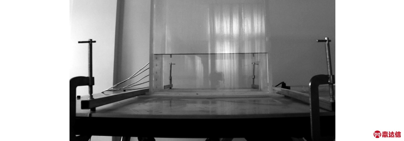 矩形容器内的液体晃荡一般可以被处理为二维流动,而球形或圆柱体中的晃荡则被处理为三维流动。试验中采用由有机玻璃制作而成的矩形液舱,其长宽高分别为600 mm,300 mm及650 mm,平台运动沿液舱长度方向模拟迎浪纵荡的船体运动工况。试验中为忽略流体与液舱结构的流固耦合现象,确保模型液舱为刚性液舱,矩形液舱模型由10 mm厚的有机玻璃板制作。一般情况下,根据液面高度与液舱长度的比值可分为浅水晃荡、有限水深晃荡以及深水晃荡。本研究主要关心的问题是二维浅水晃荡的冲击压力对外激励频率的响应规律,因此液体深度选定为90 mm,此时h/L=0.15<0.2,恰好属于低载液率浅水晃荡的范畴[25]。