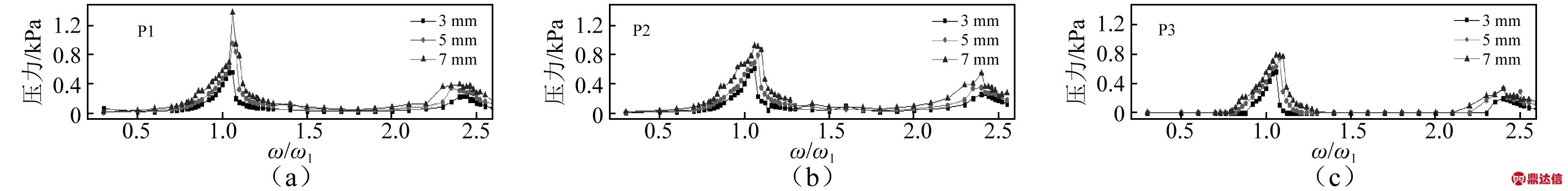 图6 不同振幅下晃荡最大冲击压力的频率响应曲线