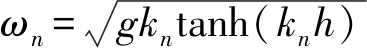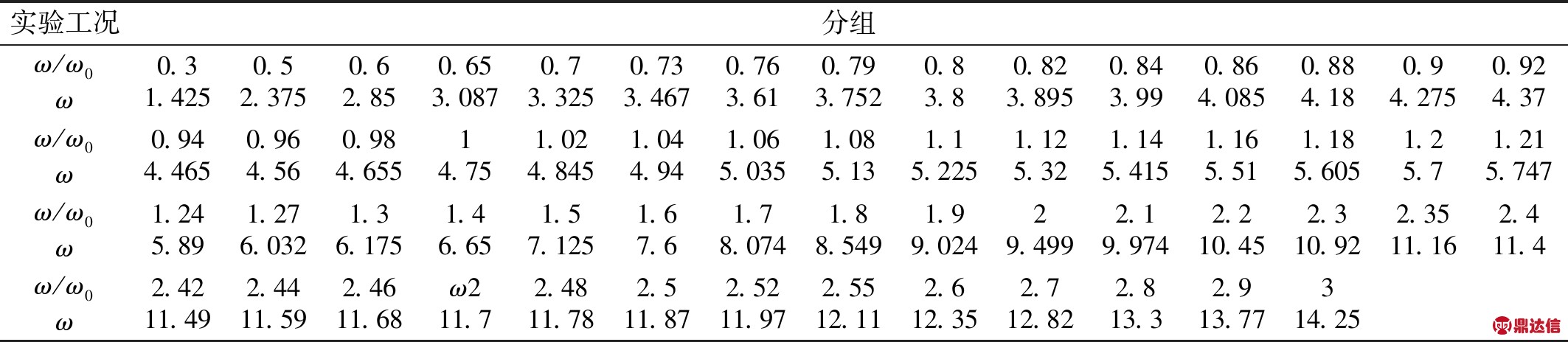 式中:kn=(2n+1)π/L,n=0, 1, 2 …;ωn为n阶固有频率;g为重力加速度;h为水深;L为液舱长度。由式(2)可计算出水深为90 mm时矩形液舱的一阶及二阶固有频率分别为,ω0 =4.749 7 rad/s和ω1=11.699 6 rad/s。试验中选取的三个振幅分别为3 mm,5 mm和7 mm,运动频率范围为0.3ω0~3ω0并在一阶频率及二阶频率附近开展扫频加密试验。每组试验时间为240 s,每种工况均以相同条件开展两组试验,用以对比及分析试验数据的准确性及可重复性。每一组试验工况的外激励频率值见表1。